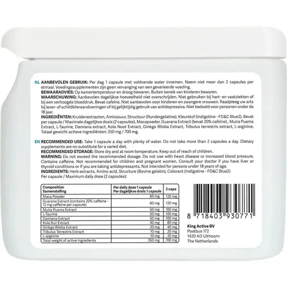 Macapoeder, Guarana Extract (bevat 20% cafeïne) , Muira Puama Extract, L-Taurine, Damiana extract, Kola Noot Extract, Ginkgo Biloba Extract, Tribulus terrestris extract, L-arginine. Kruidenextracten, Aminozuur, Structuur (Rundergelatine), Kleurstof (Indigotine – FD&C Blue2).