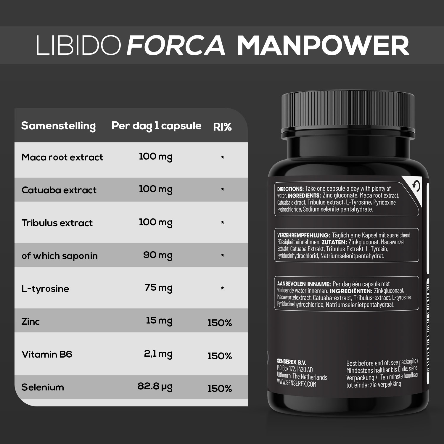 Het supplement Libido Forca Manpower van Senserex is een natuurlijke erectiepil om een erectie te ondersteunen. Als man gaat ons testosteron achteruit vanaf ons 35ste. Dit heeft ook als gevolgd dat ons libido verminderd en we meer moeite kunnen krijgen met het krijgen van een erectie. Met onze krachtige formule wordt de aanmaak van testosteron ondersteund en je libido bevorderd. Zo wordt het makkelijker om weer een erectie te krijgen.