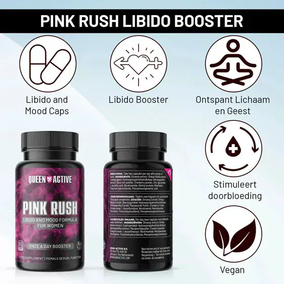 Pink Rush bevat een speciale formule aan kruiden die zorgen voor een verhoogd vrouwelijk libido en een betere doorbloeding in de vagina waardoor de vrouw niet alleen meer zin in sex heeft, maar sex is ook meteen prettiger doordat de vagina vochtiger wordt. Krachtige plantextracten zoals Ginseng, Ginko biloba, Macawortel en Damiana kunnen zorgen voor een verhoogd libido en een betere stemming door de regulering van hormonen en disbalans in lichaam en geest.